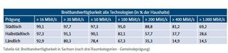 Während in städtischen Räumen mehr als 78 % aller Anschlüsse über eine Bandbreite von ≥1.000 Mbit/s verfügen, sind es nur 22,9 Prozent in ländlichen Räumen, in Sachsen sogar mit 14,5 bzw. 28,6 Prozent noch weit darunter (Quelle: letzter veröffentlichter Breitbandatlas des Bundesministeriums für Digitales und Verkehr 2021).