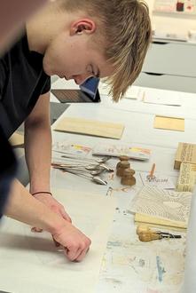 Jonah Willeke Klasse 11 beim Bearbeiten des Holzdrucks.