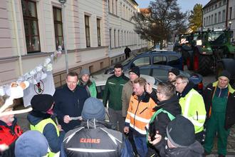 Landrat Christian Jaschinski im Austausch mit Bauernvertretern aus Elbe-Elster beim Aktionstag am 11. Januar in Herzberg vor der Kreisverwaltung.