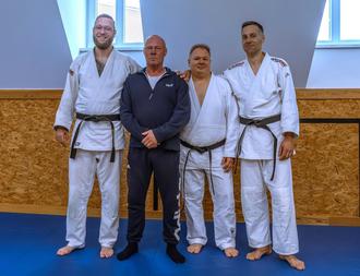 Alle drei Prüflinge wurden während dieser Zeit eng von Tom Weigelt (4. Dan) begleitet. Er stand bei jeder Trainingseinheit am Mattenrand und unterstützte die Judoka mit seinem umfangreichen Fachwissen. So wurde ihm schließlich auch die Ehre zuteil, einem der Prüflinge den schwarzen Gürtel zu überreichen. Dabei wurde vermutlich nicht nur der Schweiß aus den Gesichtern getrocknet.