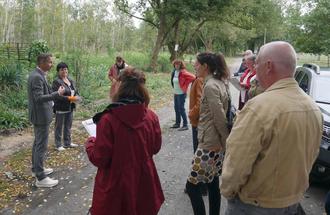 Am Bürgerpark Plessa mit Amtsdirektor Herr Göran Schrey (l.), Gästeführerin Carola Meißner (2.v.l.) und Mitgliedern der Bewertungskommission.