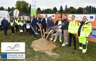 Start für den zweiten geförderten Breitbandausbau mit dem symbolischen Spatenstich in Sonnewalde mit den beteiligten Akteuren und in Anwesenheit von Landrat Christian Jaschinski und Sonnewaldes Bürgermeister Felix Freitag (beide Mitte).