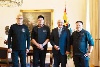 Ein besonderer Moment im Schloss Bellevue: Bundespräsident Frank-Walter Steinmeier (2.v.r.) begrüßte Dirk Müller (l.), Brotsommelier Paul Müller (2.v.l.) und Fleischermeister Tino Hauptvogel (r.) aus Elbe-Elster.