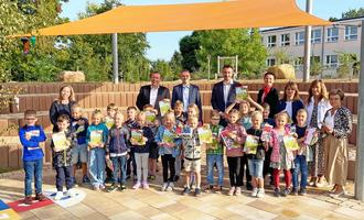 Gruppenbild mit Landrat Christian Jaschinski und Sparkassen-Vorstandsvorsitzender Frank Prescher (beiden hinten Mitte v.l.) an der Grundschule in Gröden.