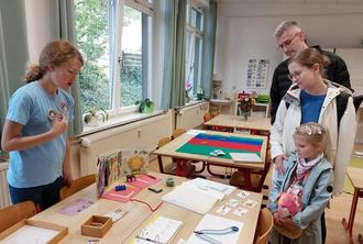 Während sich die Erwachsenen auch bei Schulleiterin Andrea Ackermann im Elternforum ausführlich über die Lernprinzipien der Grundschule informieren konnten, lockte der Duft von frischem Popcorn aus einer Popcornmaschine die Kinder von Raum zu Raum. Die Klassenräume luden nämlich nicht nur zu Malerei und Bastelarbeiten ein. Erzieherin Sarah Anger präsentierte ihre Materialien zum Unterrichtsfach „Gesunde Ernährung“, erklärte die Ernährungspyramide und wieviel Zucker die unterschiedlichen Lebensmittel enthalten. Passend dazu konnten selbstgebackenes Brot und in der Schulküche gebackene Blumenkohl-Pizza verkostet werden. In einem anderen Raum begeisterte Lehrerin Linda Schwarzenberger die Kinder mit einem schwarzen Tuch, jeder Menge Glitzer und der Geschichte über die Entstehung des Universums. Außerdem stellte sie ein Lernbüro vor, welches ihre Erstklässler nutzen dürfen, um konzentrierter und ohne Ablenkung lernen zu können. Die Erwachsenen konnten derweil die Gelegenheit nutzen und sich bei einer entspannten Tasse Kaffee und einem Stück Kuchen mit Lehrern und anderen Eltern austauschen. Das Interesse an dieser kleinen aber besonderen Schule ist groß, dementsprechend gab es viel zu erzählen.