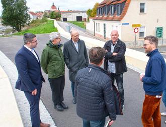 Im Anschluss informierte sich Umwelt- und Klimaschutzminister in Herzberg über die dortigen Sanierungsarbeiten der Elsterdeiche. Nach mehrjähriger Planungszeit erfolgte dort Ende 2023 der Baustart zur Verbesserung des Hochwasserschutzes. Dabei werden in einem ersten Teilobjekt die innerstädtischen Hochwasserschutzanlagen verstärkt und teilweise neugebaut. In einem zweiten Teilobjekt ist der Neubau von Flügeldeichen vorgesehen.