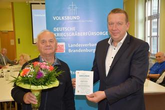 Volksbund-Mitglied Manfred Knispel aus Neuburxdorf und Kreisvorsitzender Landrat Christian Jaschinski mit der Anerkennungsurkunde für Brigitte Hantel, die nicht persönlich anwesend sein konnte.