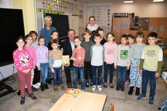 Landrat Christian Jaschinski umringt von den kleinen Zuhörern der 1. und 2. Klasse und den Lehrerinnen Saskia Hartmann (Mitte hinten) und Birgit Holzendorf.