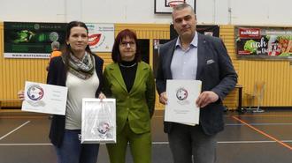 Virginie Klaus, Vorsitzende des SV 94, nahm stellvertretend für alle Vereinsmitglieder das Gütesiegel von Andrea Stapel und Falko Reichert entgegen.