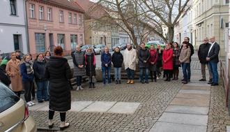 Zahlreiche Gäste versammelten sich vor dem Haupthaus des Landratsamtes in der Schliebener Straße in Herzberg. Darunter der Erste Beigeordnete des Landkreises, Roland Neumann (r.) und der Dezernent für Recht, Ordnung, Gesundheit und Landwirtschaft, Dirk Gebhard (2.v.r.).