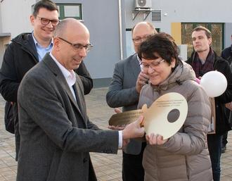 Der Erste Beigeordnete des Landkreises, Roland Neumann, übergibt den symbolischen Schlüssel an die Leiterin des Oberstufenzentrums, Sabine Lundström.