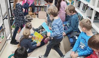 Nach der Geschichte erkundeten die Erstklässler die Fahrbücherei. Für viele Stadtkinder war es die erste Begegnung mit dem Bücherbus. Ab der zweiten Schulstunde kamen die Erst- und Zweitklässler in den Bus. Vor dem Stöbern im Bus las die Bibliothekarin Petra Stoll das Gedicht „Frieda die Letzte“ von James Krüss vor. Anschließend nutzten die Kinder die Zeit, um sich die Bücher anzuschauen.
