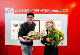 Paul Müller und Janine Niederstraßer, Marketingkoordinatorin des Landkreises Elbe Elster, freuen sich gemeinsam über den Pro Agro Marketingpreis 2025.