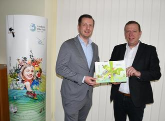 Landrat Christian Jaschinski (r.) übergab dem neuen Geschäftsführer der Tourismus-Marketing GmbH, Christian Woronka, ein kleines Willkommensgeschenk und sicherte ihm seine volle Unterstützung bei den geplanten Vorhaben zu.