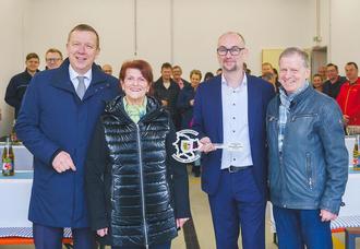 Landrat Christian Jaschinski (l.) übergab im Beisein von Schliebens Bürgermeisterin Cornelia Schülzchen (2.v.l.) und Bernd Heinke, Vorsitzendender des Werksausschusses Rettungsdienst (r.), den symbolischen Schlüssel an den Leiter des Eigenbetriebes Rettungsdienst, Sebastian Weiss (2.v.r.).