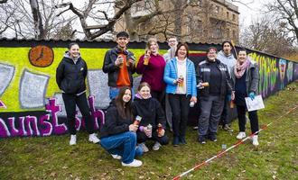 Teilnehmer des Graffiti-Projekts direkt am Kunstobjekt Mauer an der B87 Leipziger Straße/ Ecke Kaxdorfer Weg in Herzberg mit der Leiterin des Fachbereichs Kunst an der Kreismusik- und Kunstschule Gebrüder Graun, Gabi Lang (3.v.r.).