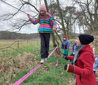 Dass es im Wald Spinnen gibt, war ja klar. Aber wie groß ihre Netze sind und dass man die Spinne beim durchklettern nicht wecken darf, war neu. Durch jedes Teil des aus Seilen zwischen zwei Bäumen gespannten Netzes sollte ein Kind, auch durch die ganz oben und natürlich nicht nur leise, sondern auch schnell. Was für eine Herausforderung! Mit Teamgeist jedoch gut zu meistern. Zu guter Letzt galt es an der letzten Station noch die Zahlen von 1 bis 10 in die richtige Reihenfolge zu bringen. Mit verbundenen Augen und der Hilfe von Klatsch-Zeichen der Mitschüler natürlich. Wenn Mathe doch immer so lustig wäre.