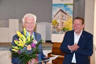 Walter Kroker (l.) erhielt nachträglich den Umweltpreis 2022 überreicht. Landrat Christian Jaschinski (r.) gehörte zu den ersten Gratulanten.