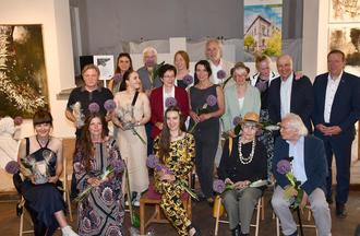 Landrat Christian Jaschinski (2. Reihe rechts) begrüßte 20 Kunstschaffende aus Elbe-Elster und den Partnerkreisen Nakielski, Racibórz und dem Märkischen Kreis im Atelierhof Werenzhain zur 14. Berufskunstausstellung.