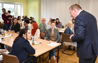 Landrat Christian Jaschinski (r.) erkundigte sich bei den Neubürgern nach ihren Eindrücken, Herausforderungen und ihrem Weg zur deutschen Staatsbürgerschaft.