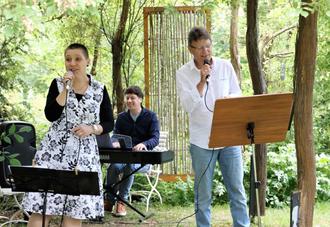 Unterhalten mit ihren Liedern im Hof des Museums Mühlberg 1547 bei Kaffee und Gebäck am 13. Juli v.l.n.r.: Steffi Marschner, Sebastian und Andreas Pöschl.