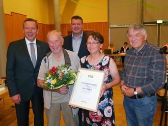 Bei der Ehrung im Kreistag v. l. n. r.: Landrat Christian Jaschinski, Horst Paulick, Kreistagsvorsitzender Thomas Lehmann, Irene Stockmann und Bernd-Jürgen Fritsch (beide Radfahrverein).
