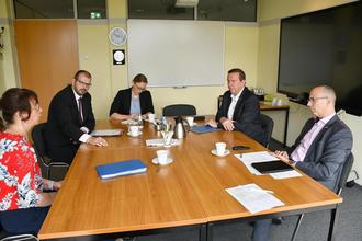 Landrat Christian Jaschinski (2. v. r.), der Erste Beigeordnete Roland Neumann (r.) und Amtsleiterin Anja Miersch (l.) im Gespräch mit Brandenburgs Bildungsminister Steffen Freiberg (2. v. l.).