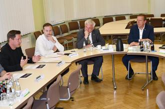 Landrat Christian Jaschinski hatte die Bundestagsabgeordneten Knut Abraham (2. v. r.) und Hannes Walter (l.) in die Kreisverwaltung nach Herzberg eingeladen, um sie in die geplante Neuausrichtung des Elbe-Elster-Klinikums mit einzubeziehen.