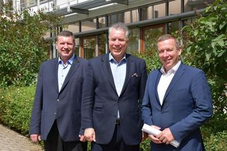 Der Kreistagsvorsitzende Thomas Lehmann, der CDU-Europaabgeordnete des Landes Brandenburg, Dr. Christian Ehler, und Landrat Christian Jaschinski (v.l.n.r.) vor der Kreisverwaltung Elbe-Elster in Herzberg.