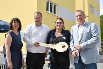 Mit der symbolischen Schlüsselübergabe wurde am 23. Juni 2025 der Erweiterungsbau der Gemeinschaftsunterkunft des Landkreises Elbe-Elster in der Leipziger Straße 7 in Herzberg offiziell seiner Bestimmung übergeben. Landrat Christian Jaschinski, die Dezernentin für Bildung, Jugend, Soziales und Kultur, Anja Miersch, sowie Dipl.-Ing. Michael Nickisch von der bau plan GbR würdigten in ihren Grußworten die Bedeutung des Bauvorhabens für die Unterbringung und Integration von geflüchteten Menschen im Landkreis Elbe-Elster. Landrat Christian Jaschinski: „Mit diesem Erweiterungsbau schaffen wir nicht nur Wohnraum, sondern auch Perspektiven. Die Gemeinschaftsunterkunft Herzberg ist ein Ort, an dem Ankommen und Mitgestalten ermöglicht wird.“