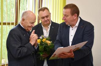Landrat Christian Jaschinski (rechts) überreichte gemeinsam mit Laudator Dr. Gerd Günther (Mitte) die Urkunde und Medaille des Kulturpreises für Denkmalpflege 2024 an Dr. Wolfgang Böllhoff (links).