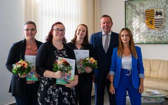 Neben den neuen Auszubildenden setzen drei ausgelernte Auszubildende ihre berufliche Karriere in der Kreisverwaltung fort. In einer feierlichen Zeremonie wurden die Arbeitsverträge übergeben. Die neuen Mitarbeitenden werden im Sozialamt, im Finanzverwaltungsamt und in der Kreiskasse eingesetzt und verstärken so die Teams mit ihrem frisch erworbenen Wissen.