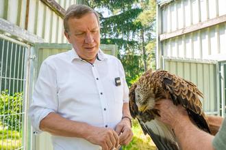Landrat Christian Jaschinski in der Greifvogelstation mit einem Rotmilan.
