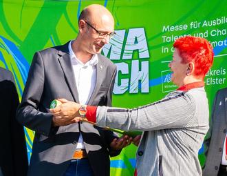 Rückblick 2024: Claudia Sieber, Bürgermeisterin der Verbandsgemeinde Liebenwerda, übergibt den Match-Staffelstab an Torsten Drescher, Fachbereichsleiter Wirtschaftsförderung der Stadt Finsterwalde.