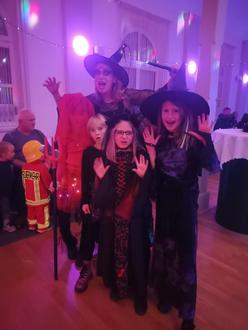 grüßte ein Gespenst und hingen Spinnweben von der Decke, der Saal war in eine Gruselhöhle mit vielen großen und kleinen Spinnen, weiteren Gespenstern, Licht- und Toneffekten verwandelt. Die sehenswerten Dorfhexen begrüßten die kleinen Kobolde und Monster mit ihren Eltern und führten durch den Nachmittag, der mit gemeinsamen Tänzen, Spielen und natürlich auch Süßigkeiten für alle ein Erlebnis war.