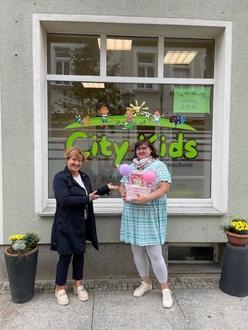 Bürgermeisterin Anja Heinrich besuchte die junge Unternehmerin am Tag der offenen Tür und hieß sie im Namen der Stadt mit einem bunten Spielekorb herzlich willkommen.