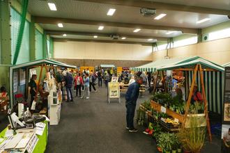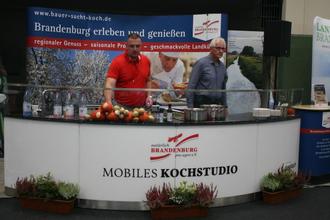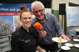 An beiden Veranstaltungstagen war neben dem Außengelände auch die kleine Turnhalle mit Leben gefüllt. Zahlreiche Aussteller, Händler und Produzenten regionaler Produkte präsentierten sich in diesem Rahmen und boten ihre Waren zum Verkauf. Beim mobilen Kochstudio von pro agro empfing Moderator Detlef Olle Stefan Köckeritz vom Nahkauf, der eine leckere Kürbissuppe zubereitete sowie Konditorin Geraldine Lösche, die mit süßen Versuchungen die Besucher bezirzte.