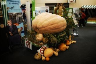 Auch konnten die Besucherinnen und Besucher einen der Rekord-Kürbisse von Oliver Grafe aus Großthiemig bewundern. Sein knapp 700 kg schweres Exemplar der Sorte „Atlantic Giant“ war, ebenfalls festlich geschmückt, am Eingang der Halle zu bewundern.