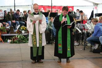 Gemeinsame Predigt von Pfarrer Stephan Werner (l., katholisch) und Pfarrerin Marie-Luise Zott (r., evangelisch) anl. des Erntedank-Gottesdienstes am 01. Oktober 2023
