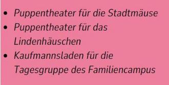 Mitte Oktober 2024 konnten in den Einrichtungen zur Kinderbetreuung die Puppentheater und der Kaufmannsladen übergeben werden. Die Kinder können sich ihr Theater dank der vielen, aus Holz gefertigten Teile nach Bedarf und Lust selbst gestalten und mit den einzigartigen Hand- und Fingerpuppen Geschichten spielen. Für den Kaufsmannsladen gab es verschiedenste Waren - aus Wolle gehäkelt. Vom Obst bis zur Würstchenkette kann nun alles angeboten werden.