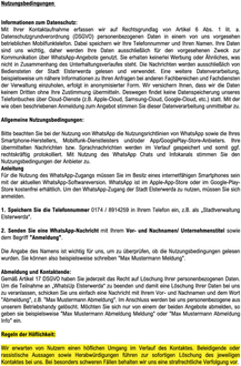 Bitte beachten Sie bei der Nutzung von WhatsApp die Nutzungsrichtlinien von WhatsApp sowie die Ihres Smartphone-Herstellers, Mobilfunk-Dienstleisters und/oder App/GooglePlay-Store-Anbieters. Ihre übermittelten Nachrichten bzw. Sprachnachrichten werden im Verlauf gespeichert und somit ggf. rechtskräftig protokolliert. Mit Nutzung des WhatsApp Chats und Infokanals stimmen Sie den Nutzungsbedingungen der Anbieter zu.