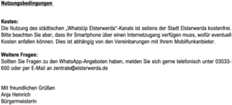 Die Nutzung des städtischen „WhatsUp Elsterwerda“-Kanals ist seitens der Stadt Elsterwerda kostenfrei.