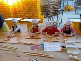 Dort angekommen, wartete bereits eine vorbereitete Backstube mit einer langen Tafel auf uns. Doch bevor es an das Backen ging, wurden alle Kinder mit Backschürze und Backhut ausgestattet. Nun konnte es endlich losgehen. Alle Kinder bekamen vorbereitete Teigrohlinge, aus denen nun Hefezöpfe geflochten wurden. Das Personal der Bäckerei Raddatz half den Kindern bei der Flechttechnik. Im Anschluss durften die geflochtenen Hefezöpfe mit verschiedenen Zutaten verziert werden. Es entstanden viele tolle Kreationen, welche mit viel Mühe und Kreativität erschaffen wurden.
