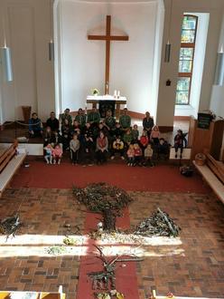 Im Oktober trafen wir uns schon bei etwas kühleren Temperaturen, hörten die Geschichte vom verlorenen Schaf und von unserer Aufgabe, auf unsere Mitmenschen und die Natur zu achten und zu respektieren. Davon inspiriert machten wir uns direkt nach der Andacht auf zu einer Abenteuerwanderung. Im Wald wurden viele Dinge bestaunt, gefunden und manches gesammelt, das wir später für unser Waldmandala brauchten. In der Christuskirche in Biehla erstrahlte dann ein wunderschönes Herbstbild mit großem Baum, Hase und Igel, einem Hirsch und einem Berg. Die Kinder und auch die Erwachsenen waren mit großem Engagement und Fantasie dabei, sowohl beim Legen des Bodenbilds als auch beim Aufräumen hinterher. Gemeinschaft, Respekt und das Leben mit und in der Natur wurde so für alle erlebbar und spürbar.
