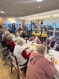 Die Cafeteria war dem Anlass entsprechend sehr schön dekoriert. An der langen Tafel fanden die Bewohner Platz, um gemeinsam zu genießen. Es wurde gelacht, erinnert, erzählt- und natürlich geschlemmt.