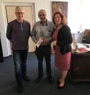 Mit aufrichtigem Dank und den besten Wünschen für eine erfüllte und von Gesundheit stets gut begleitete Pensionszeit verabschiedeten Anja Heinrich und Ansgar Große den ehemaligen Beigeordneten und Kämmerer mit der aus der Geschichte des Gärtnerhauses traditionellen Ananas. In gutem Kontakt werden alle bleiben. Auch den Besuch des Classic Open Airs in Elsterwerda hat sich Peter Hans, der nun wieder im Saarland lebt, fest vorgenommen.