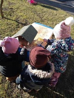 Zur Bild- und Buchbetrachtung wurden sie so mit dem neuen Wortschatz bekannt gemacht. Passende Lieder wie „Kleine Meise…“ und verschiedene Sprüche füllten das Projekt. Ein Vogelhäuschen wurde genau betrachtet, erklärt und jeder konnte spielerisch mit einem Vöglein die Futtersuche nachspielen. Dann streuten die Kinder Körner in das Häuschen und es bekam seinen Platz am Baum vor unserer Terrassentür. Mal sehen ob bald ein kleiner Gast vorbei geflogen kommt;-)