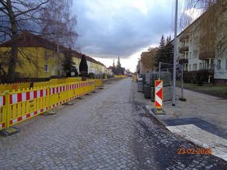 Bis Ende März soll der Rückbau des Gehweges, der Zufahrten, der Pflasterdecke Fahrbahn und der alten Straßenabläufe realisiert werden. Von Ende Februar bis Ende März werden die Kabelverlegearbeiten der Mitnetz Strom GmbH, die Glasfaserverkabelung durch die Lausitzer Kabel Service GmbH sowie der Rückbau der Gasleitung für die NBB durchgeführt, um im Anschluss daran den Gehweg, die Zufahrten, die Straßenentwässerung, die Parktaschen und die Fahrbahnpflasterdecke baulich bis Mitte Mai herzurichten. Die erforderlichen beidseitigen Landschaftsbauarbeiten sollen hier Anfang April abgeschlossen werden.