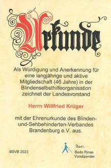Willfried Krüger übergab aus Krankheitsgründen den Vorsitz an Tamara Groß. Herr Krüger war 46 Jahre stellv. Vorsitzender des Vereines unter anfangs Katharina Felsch, danach Ida Willkes Leitung, die ebenfalls aus Krankheitsgründen ausscheiden musste und somit Willfried Krüger die Führung übernahm.