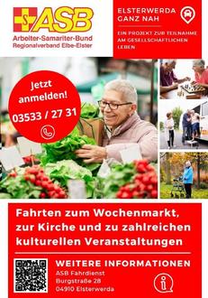 Wir freuen uns, Ihnen zu dieser Veranstaltung eine ganz besonders komfortable Anreise ermöglichen zu können. In Zusammenarbeit des Arbeiter Samariter Bundes Elbe-Elster und der Stadt Elsterwerda wurde vor einigen Monaten das Projekt „Elsterwerda ganz nah“ im Rahmen der Förderrichtlinie „Pflege vor Ort“ des Landes Brandenburg ins Leben gerufen. Dieses Projekt ermöglicht es Ihnen, für ein sehr geringes Entgelt einen Fahrdienst in Anspruch zu nehmen. Ein Fahrer wird Sie zu Hause an der Haustür abholen und komfortabel ins Stadthaus und im Anschluss der Veranstaltung wieder nach Hause fahren.